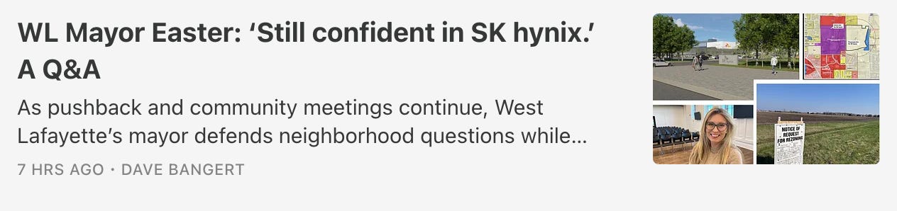 ICYMI, WEST LAFAYETTE MAYOR ERIN EASTER MAKES HER CASE FOR SK HYNIX PLANS: In ongoing coverage of SK hynix’s plans – and the pushback by neighbors who live in nearby subdivisions – here’s a Q&A published Thursday morning with West Lafayette Mayor Erin Easter on why she defends neighborhood questions while standing by the semiconductor company’s plans ahead of the city council zoning vote May 5. Read it here: