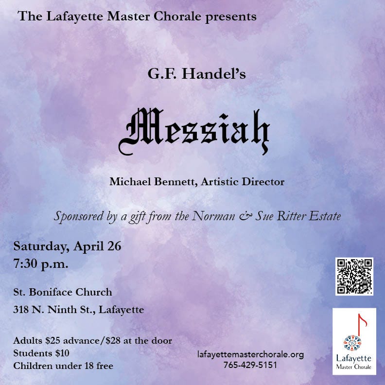 Thanks, again, for support from Lafayette Master Chorale, presenting Handel’s Messiah at 7:30 p.m. Saturday, April 26, at St. Boniface Church in Lafayette. Get tickets and more information here.