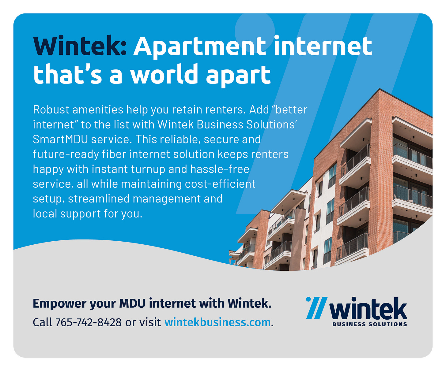 Support for this edition comes from Wintek Business Solutions. You go above and beyond on apartment amenities to retain renters. Add “better internet” to their reasons to stay with Wintek Business Solutions’ SmartMDU service. Tenants will love the immediate turnup and secure, hassle-free service. You’ll love the cost-efficient setup, streamlined management and local support. And everyone will love reliable property-wide connectivity for years to come. Contact Mike Barron today for a free consultation and property assessment. Call 765-269-8522 or email mbarron@wintek.com.