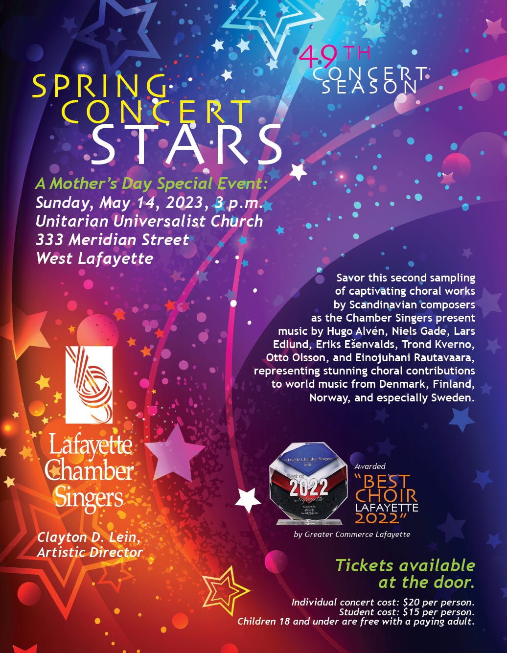 Thanks, again, to sponsor the Lafayette Chamber Singers, presenting a Mother’s Day concert at 3 p.m. Sunday, May 14, at Unitarian Universalist Church, 333 Meridian St. in West Lafayette. For more details, go to: www.lafayettechambersingers.org/home.