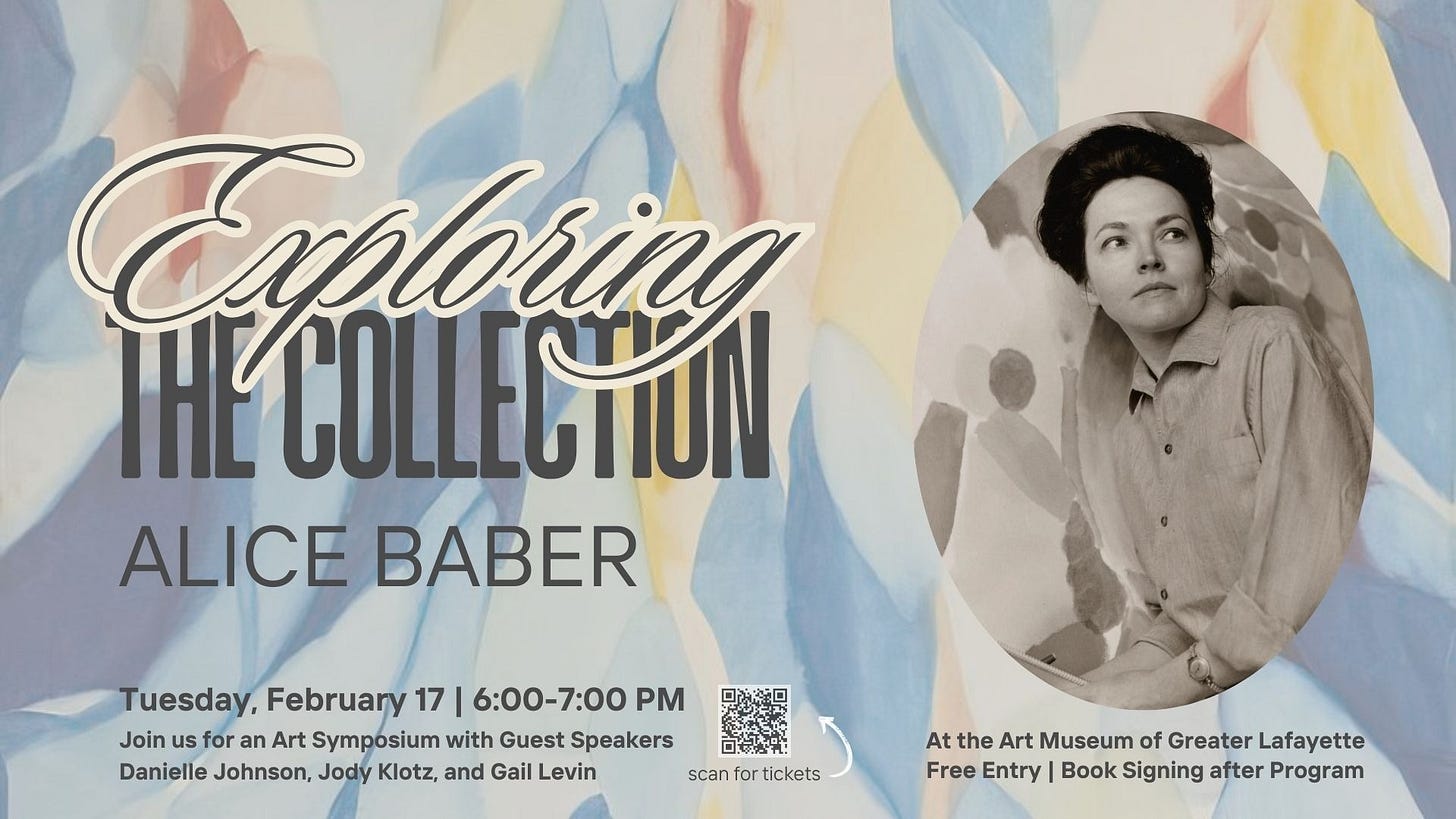 Thanks, again, for support for this edition from the Art Museum of Greater Lafayette, presenting the symposium “Exploring the Collection: Alice Baber” Feb. 17. Free tickets.