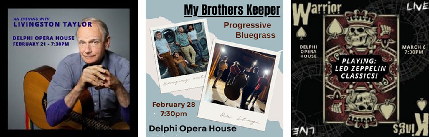 Thanks, again, for support for this edition from Delphi Opera House, where the 10th Anniversary Season continues. For the lineup, tickets and more, go to www.delphioperahouse.org.