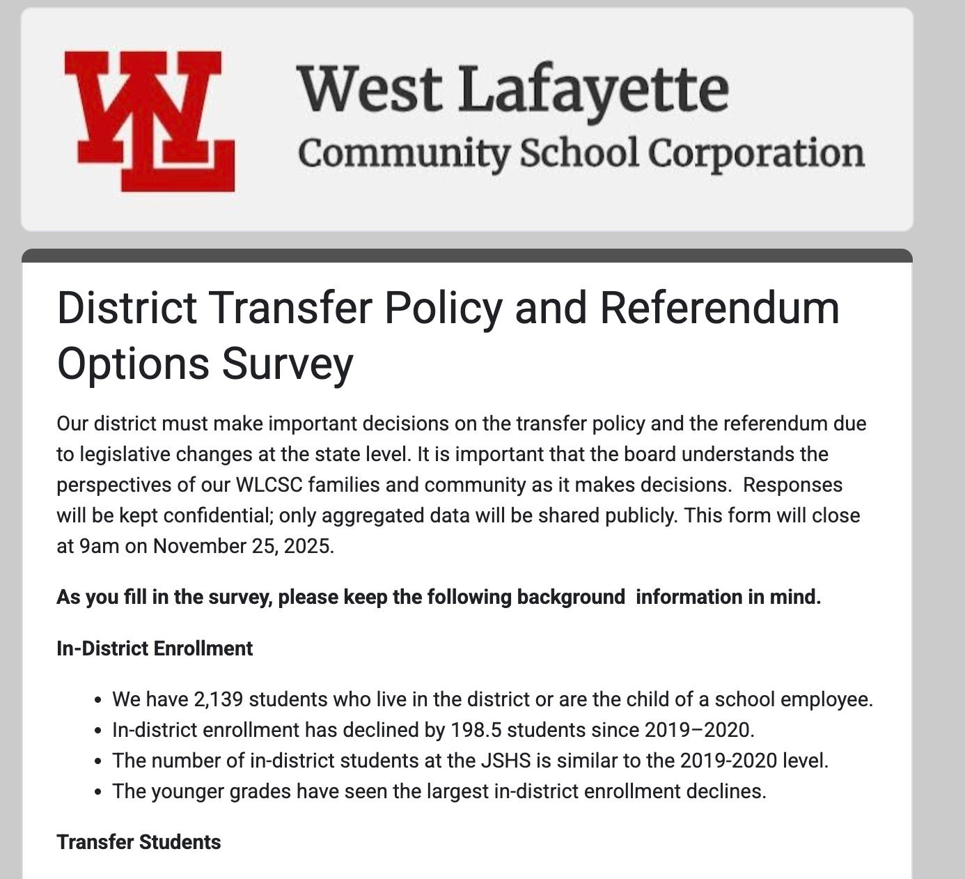 Following up on last week’s West Lafayette school board conversation about finances in an age of property tax reform, what to do about student transfer policies and the prospects of going to voters again in 2026 for an updated property tax referendum, West Side sent a new survey for parents and the community to gauge sentiment beyond the school walls.