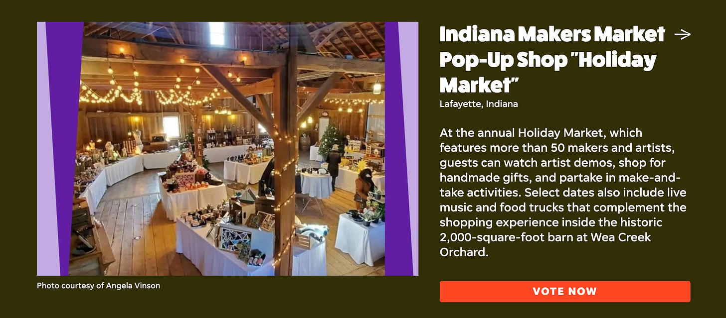 The Indiana Makers Market Pop-Up Shop, set for a three-weekend holiday run starting Nov. 29 at Wea Creek Orchard just south of Lafayette, popped up in a USA Today Readers’ Choice Awards poll for holiday markets. The list includes markets in Carmel, New York, Chicago, Bethlehem, Pennsylvania and more. “I know it is really just a popularity contest,” Angela Vinson, who organizes the Indiana Makers Market pop-ups through the year, said. “But to be included is pretty cool.” Voting runs through noon Dec. 1, with a Top 10 announced Dec. 10, according to USA Today. The Indiana Makers Market will be open Nov. 29-30, Dec. 5-7 and Dec. 12-14 at Wea Creek Orchard, 5618 S. County Road 200 East. For hours and details, go to IndianaMakersMarket.com.