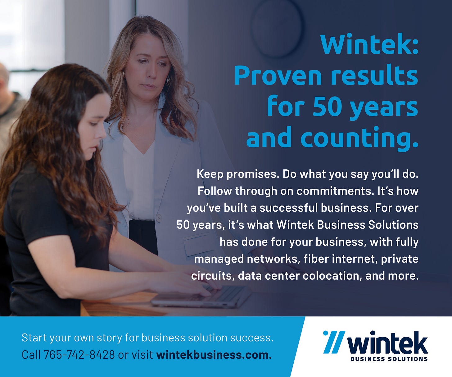 Support also comes from Wintek Business Solutions. Wintek Business Solutions was at the leading edge of greater Lafayette fiber broadband connections. We have two decades (and counting) of partnership with Cisco for premier products, and we offer comprehensive business solutions like dark fiber, multi-gig services and more. That’s what a half-century-plus of forward thinking gets you. But don’t just take it from us. Hear from our clients, then start your own business solution success story. Call 765-742-8428 or visit wintekbusiness.com.
