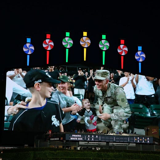 A BIG WHITE SOX WELCOME HOME, SGT. LACOSSE: Wow, what a return home from Kuwait for Army Sgt. 1st Class Daniel LaCosse, as seen on the video board in real time in the middle of the third inning of Wednesday night’s Chicago White Sox game.