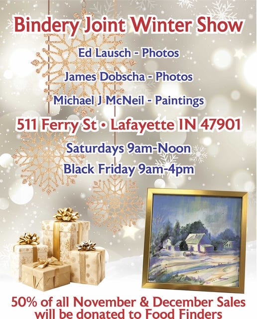 Support for today’s edition comes from The Bindery Artist Studios in downtown Lafayette, presenting the Bindery Joint Winter Show through December. The show, featuring photographers Ed Lausch and James Dobscha and painter Michael McNeil, will be 9 a.m.-4 p.m. Friday, Nov. 28, and 9 a.m.-noon Saturdays, now through the end of December at the studios, 511 Ferry St. The artists will donate 50% of all sales during the show to Food Finders Food Bank.